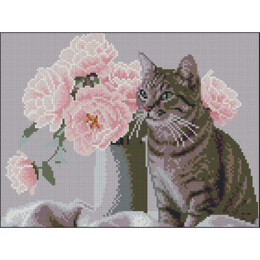 ZAV3040-59 Strateg Алмазна мозаїка - Кіт з квітами, 30x40 см (круглі, на підрамнику, Стратег)