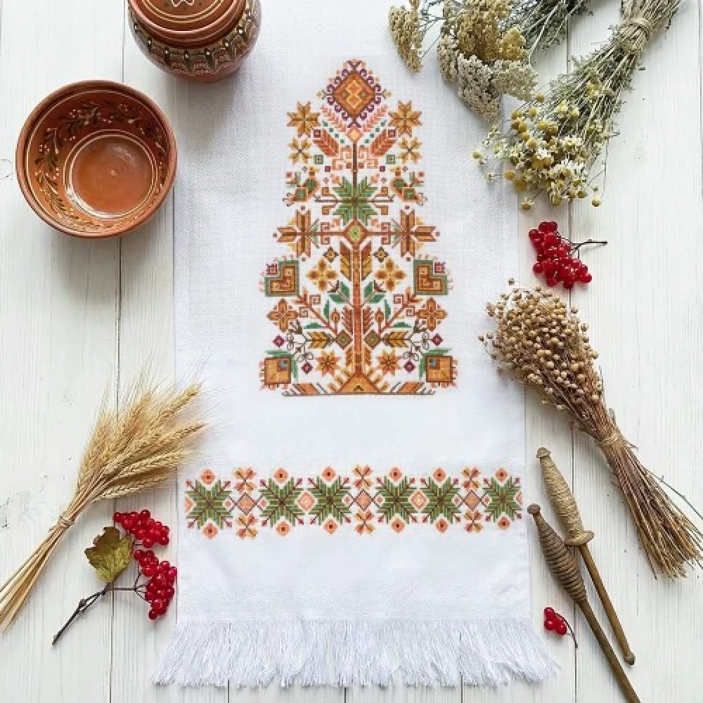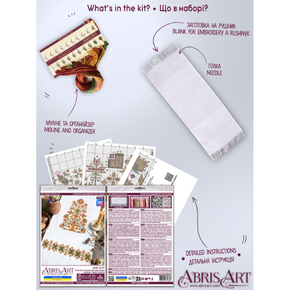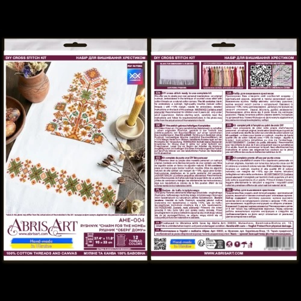AHE-004 Абрис Арт Рушник Оберіг дому — набір для вишивки хрестиком на заготовці рушника з канви Aida 18. Заготовка має достатній запас по розміру, бахрому та декоративні вставки, а широка вставка для вишивки передбачає висоту 30 см, що робить процес комфортним і зручним. Схема розроблена дизайнерами виробника для цього сюжету, має чіткі позначення та доповнена інструкцією, тому підійде як досвідченим майстриням, так і тим, хто лише починає працювати з вишивкою хрестиком.
