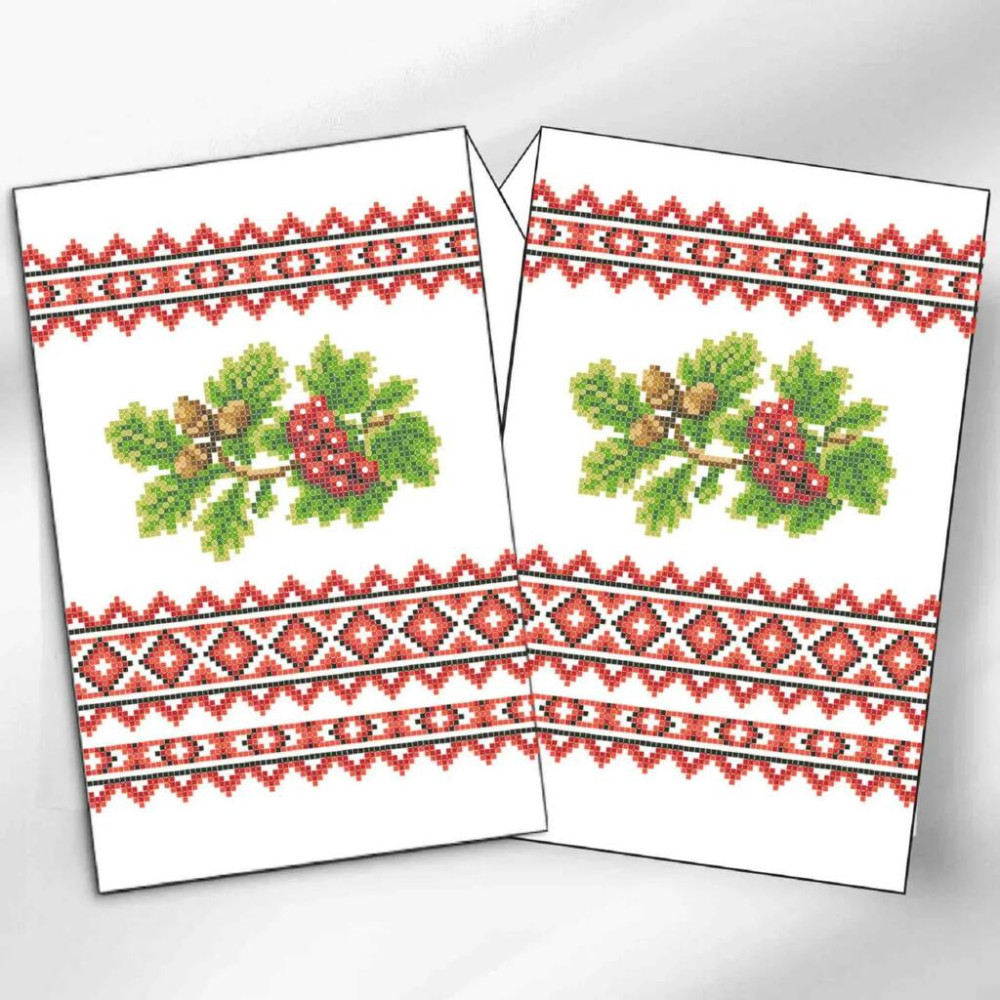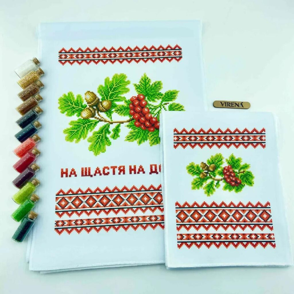 Рушник для вишивки бісером на габардині, який проклеєний флізеліном у місцях вишивки. Зрізи рушника обметані. Малюнок водостійкий. Схема чітка з насиченими кольорами та високою якістю друку.