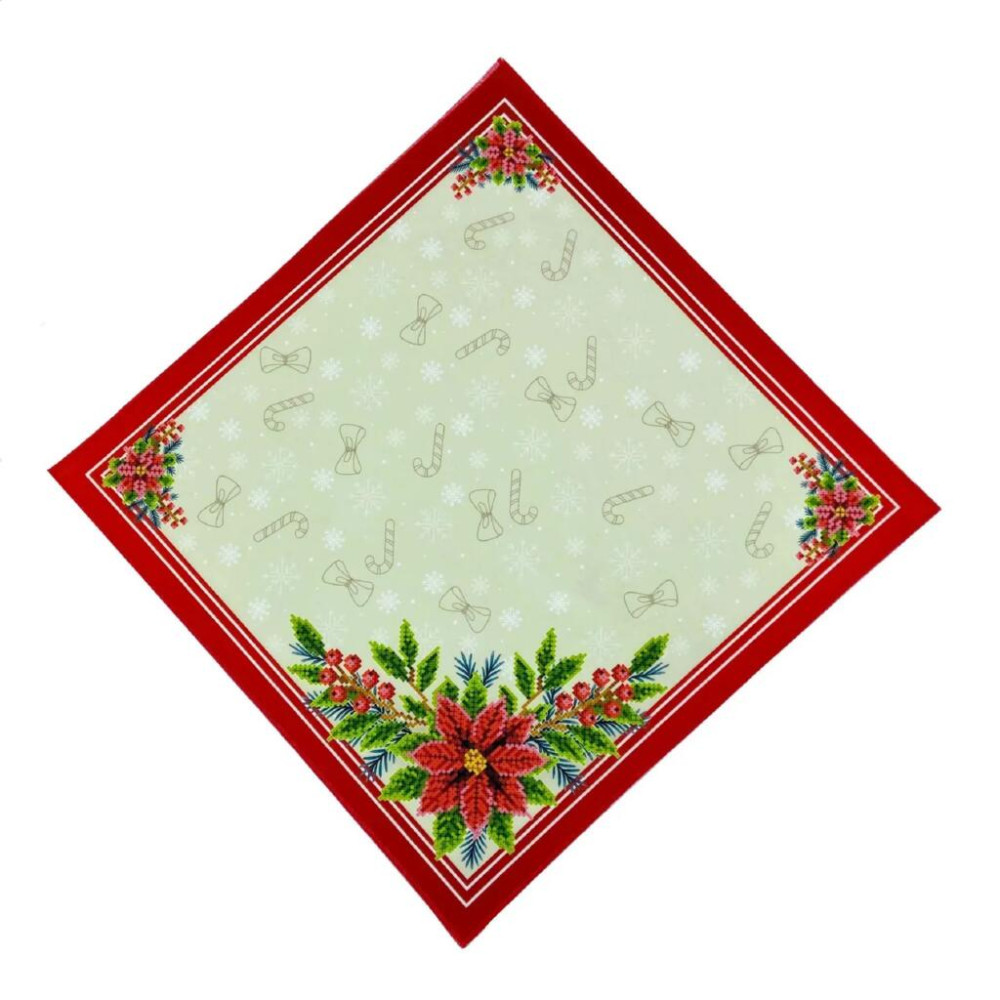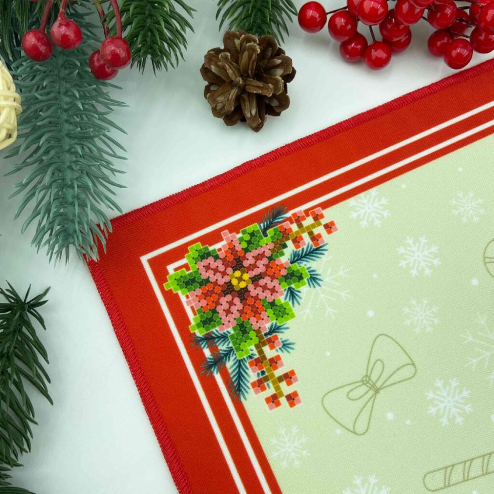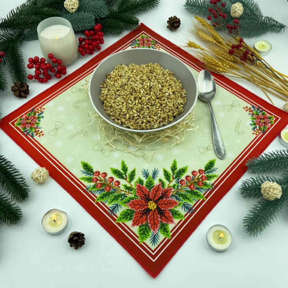 Набір для вишивки бісером серветки, виріб має чітку схему з насиченими кольорами та високою якістю друку на якісному габардині, якій проклеєно флізеліном. Після прання схема для вишивки залишається на тканині. Зрізи серветки фігурно обрізані.
