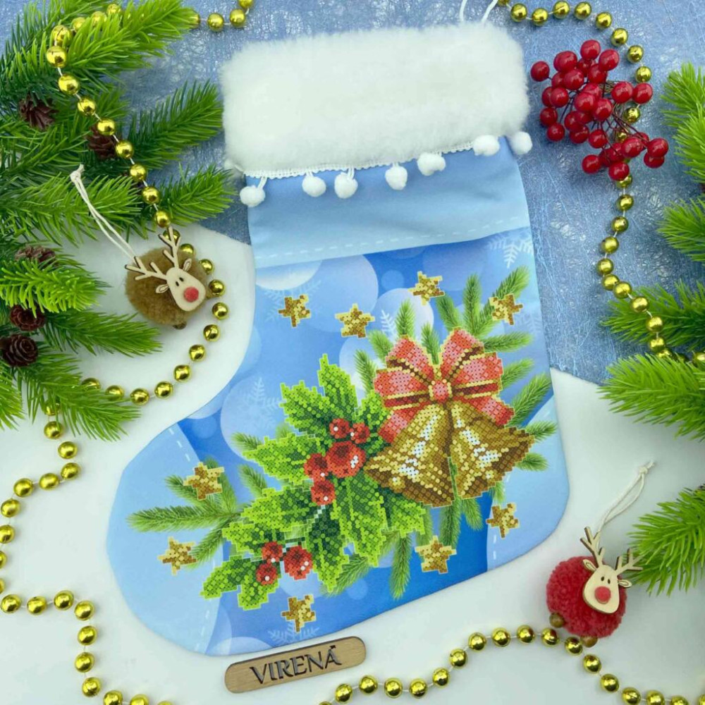 Декоративний чобіток під вишивки бісером, має чітку схему з насиченими кольорами та високою якістю друку на габардині, який проклеєно флізеліном. Після прання схема для вишивки залишається на тканині. Чобіток оздоблений штучним хутром з помпонами.
