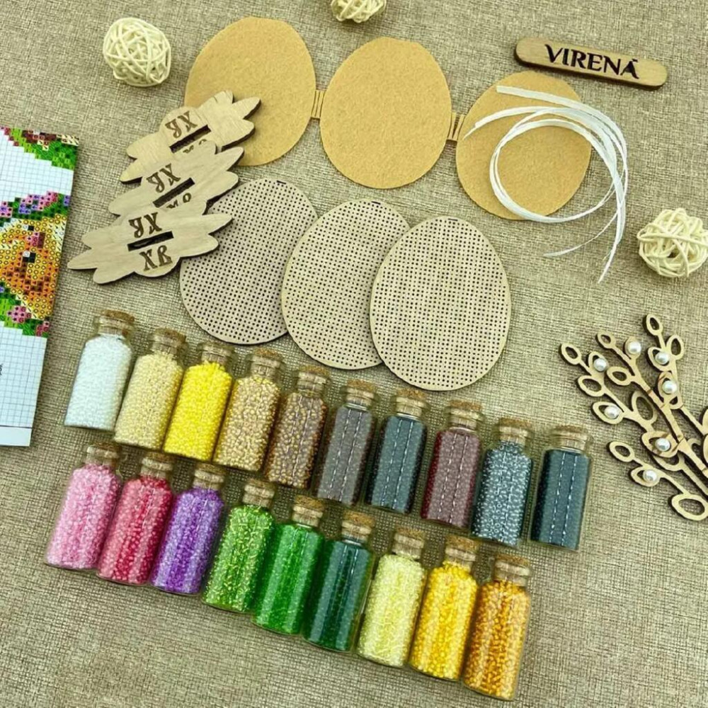 Набір Virena створений для вишивання великодніх міні-іграшок бісером на перфорованих дерев’яних заготовках. У комплекті передбачено все необхідне для двостороннього оформлення: фігурний фетр для задньої сторони та стрічки для підвішування, тож готові іграшки зручно використати як святковий декор.