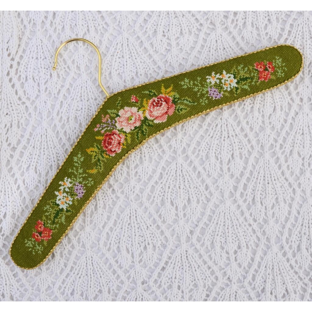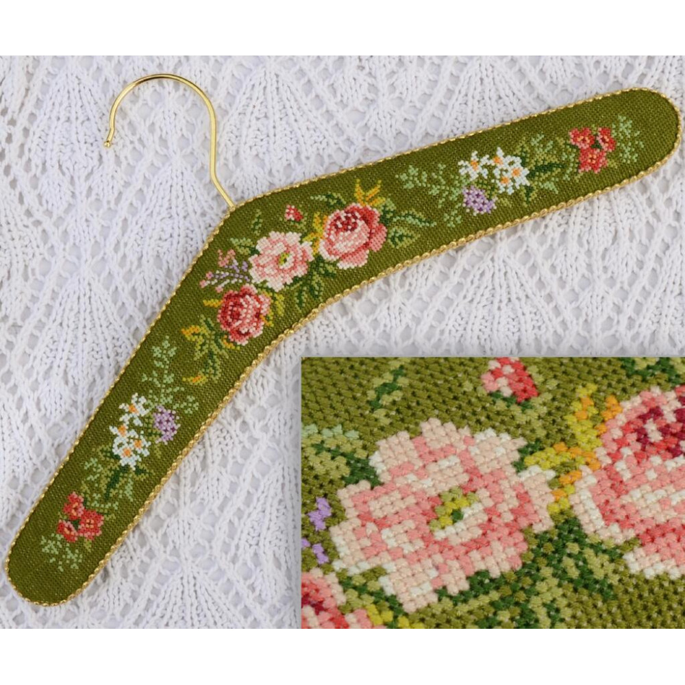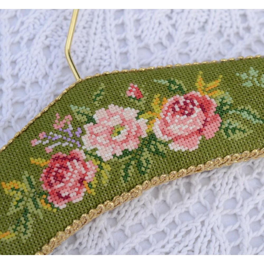 Набір для вишивки рахунковим хрестиком «Плечики Троянди на зеленому» — це оригінальний творчий проєкт для створення декоративного вішачка власноруч. Такий виріб стане стильним аксесуаром для інтер’єру, фотосесій, зберігання одягу або оформлення рукодільного простору.