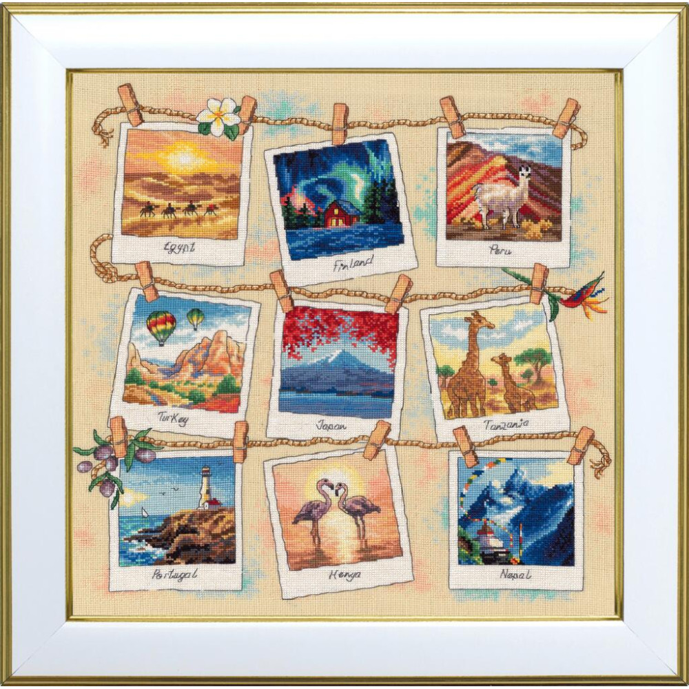 Набір для вишивки рахунковим хрестиком із тематикою подорожей дозволяє створити декоративну картину у стилі семплера. Композиція з ілюстраціями різних куточків світу нагадує серію пам’ятних фотографій, що передають атмосферу мандрівок.