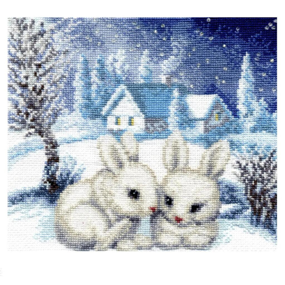 Ніжний зимовий сюжет із двома білими зайчиками передає атмосферу тихого зимового вечора та святкового затишку. Гармонійна композиція створює казковий настрій і дозволяє насолодитися творчим процесом вишивки.