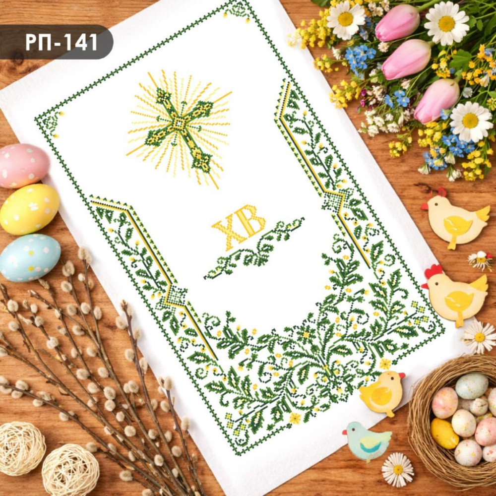 Пасхальний рушник-заготовка виконаний на домотканому полотні та повністю підклеєний флізеліном, що забезпечує стабільність основи під час вишивання. Для зручності роботи рушник оверложений по краях. Нанесений малюнок-схема добре читається та підходить для вишивання як бісером, так і нитками.