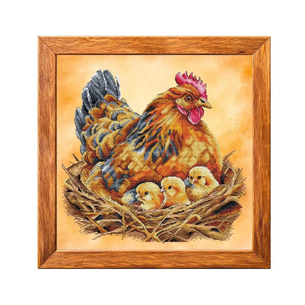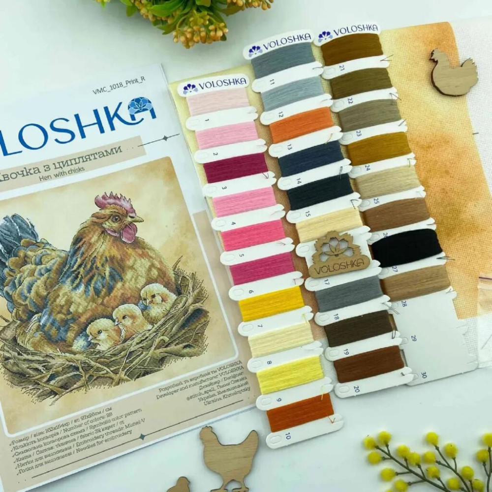 VMC_1018_A Voloshka Квочка з курчатами — набір для вишивання у техніці рахункового хрестика. У комплектації використані перевірені та якісні матеріали: нитки Mishel-V та принтована канва Aida 16 Zweigart. Продуманий підбір матеріалів забезпечує комфорт у роботі та акуратний результат. Чітка схема та інструкція дозволяють швидко зорієнтуватися в процесі вишивання.